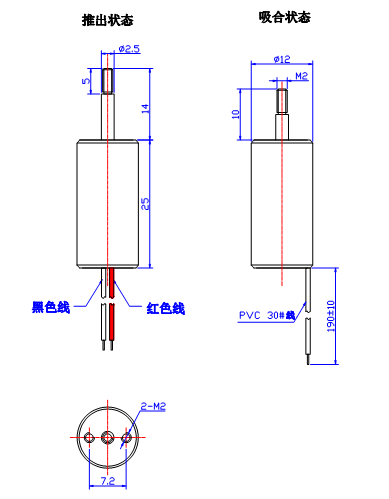 產(chǎn)品尺寸:直徑12mm    *   高度25mm  頂 桿直徑2.5mm   螺紋為M2